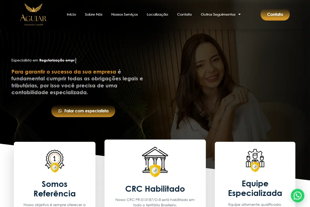 Site institucional para a Aguiar Contábil, com design em amarelo e preto, transmitindo modernidade e confiança. Estrutura clara, destaque para serviços e foco em credibilidade no setor contábil