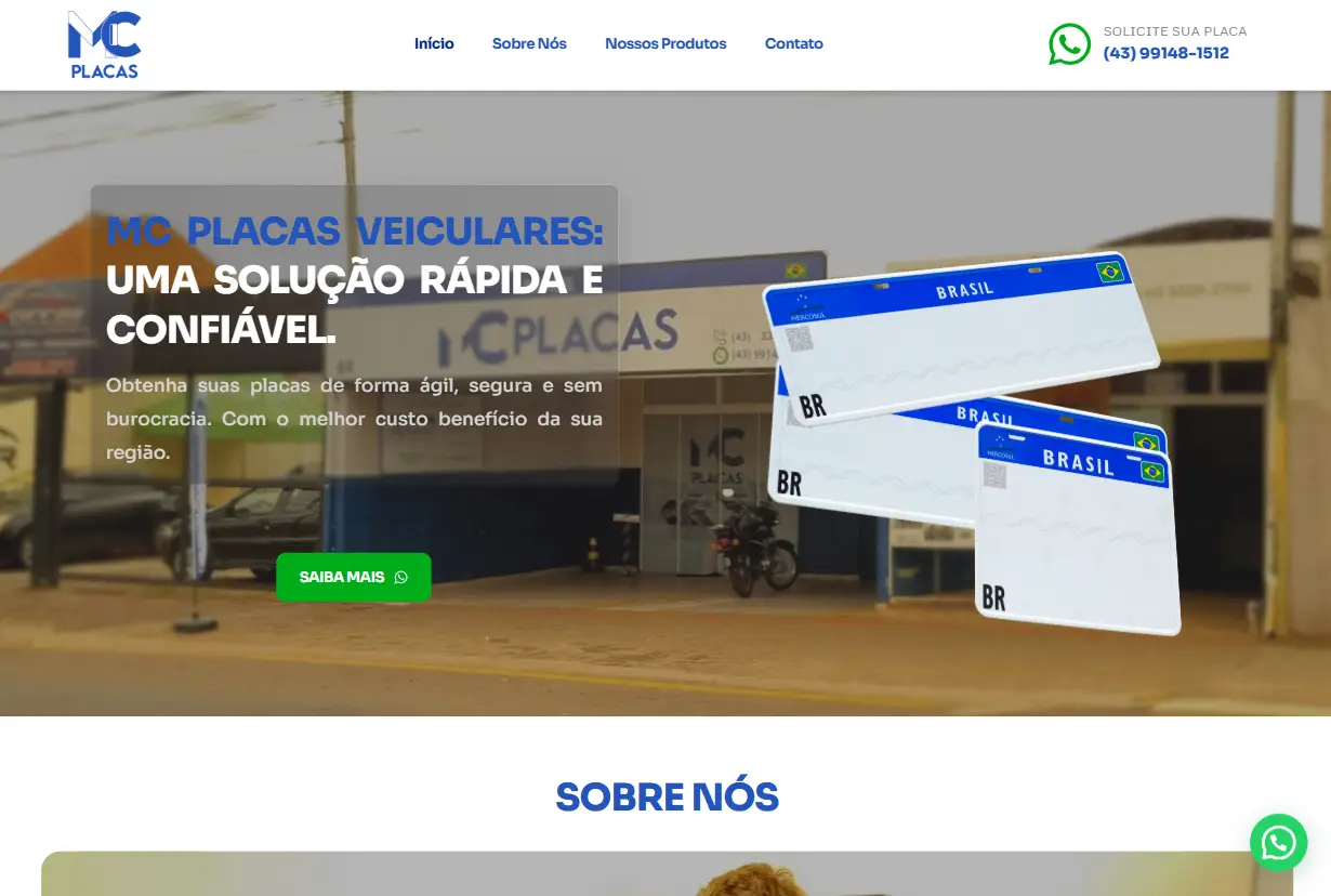 Site moderno e responsivo para a MC Placas, com design em azul e branco, transmitindo confiança e clareza. Estrutura simples, foco em conversão e agilidade na emissão de placas automotivas