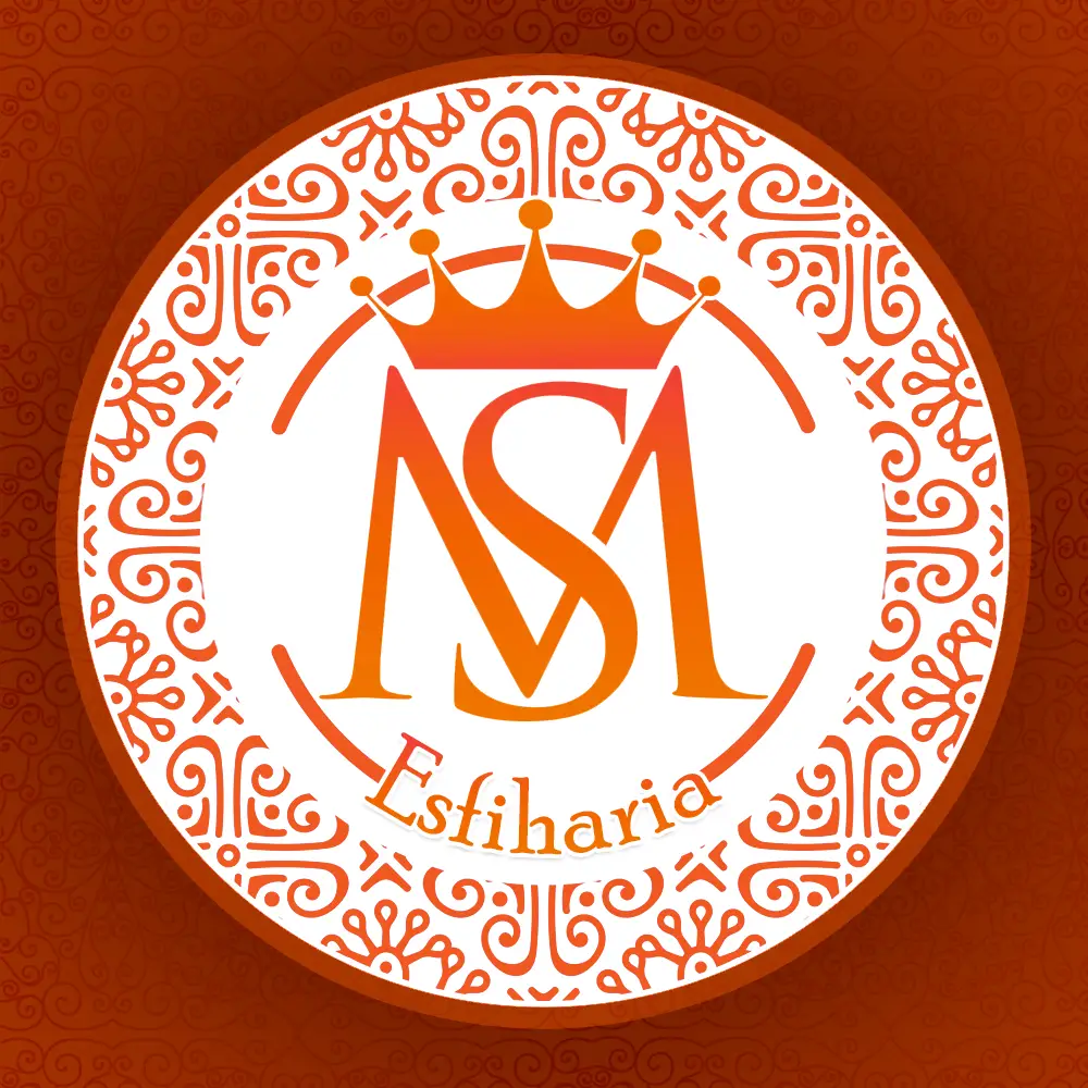 Identidade visual da MS Esfiharia, com cores quentes em laranja e vermelho que despertam apetite, coroa simbolizando qualidade e bordas ornamentais que remetem à tradição da culinária árabe.