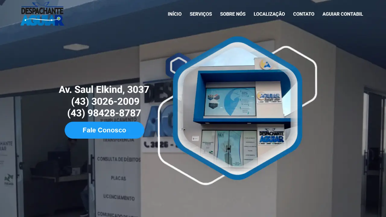 Site institucional para o Despachante Aguiar, com design em azul e branco, transmitindo confiança e clareza. Estrutura simples, serviços destacados e foco em agilidade e credibilidade no atendimento.