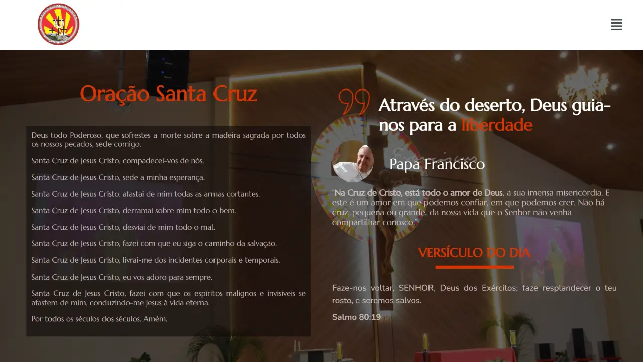 Foi desenvolvido um site para a Paróquia Santa Cruz em tons de vermelho, marrom e branco, transmitindo fé, acolhimento e espiritualidade, com foco em destacar orações, mensagens e versículos.