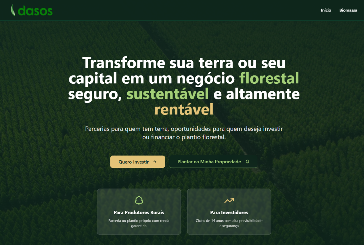 Site institucional para a Dasos Florestal, com identidade visual natural, transmitindo sustentabilidade, confiança e clareza. Estrutura simples, serviços florestais destacados e foco em agilidade, responsabilidade ambiental e credibilidade no atendimento.